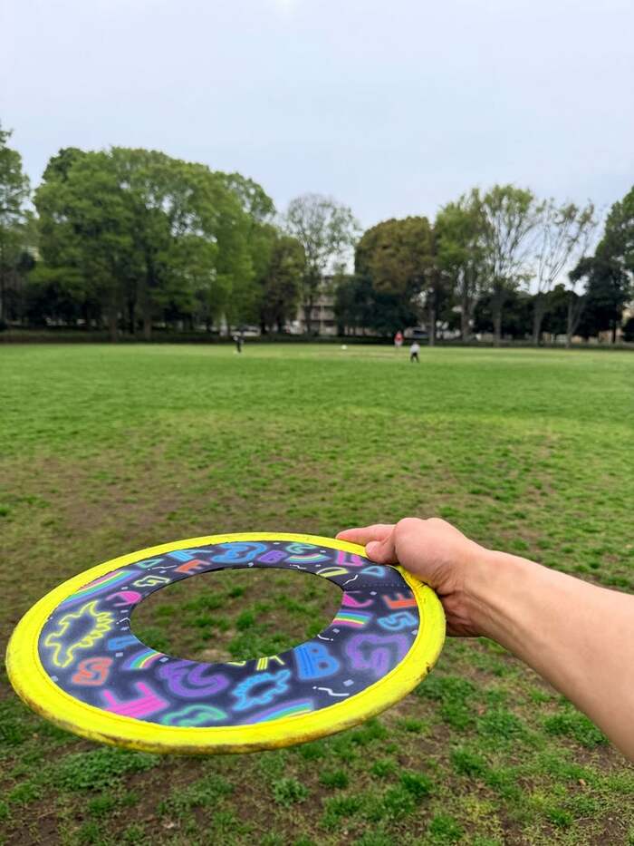 写真には、一面芝生が広がった大きな公園で、フライングディスクを持つ杉浦さんの手元が写っています。「運動させたかったので、桜は遠目に眺めながらw」と、元気よく遊んだそうで、遠くの方にはぽつんと立つ幸空くんと思われる姿がありました。