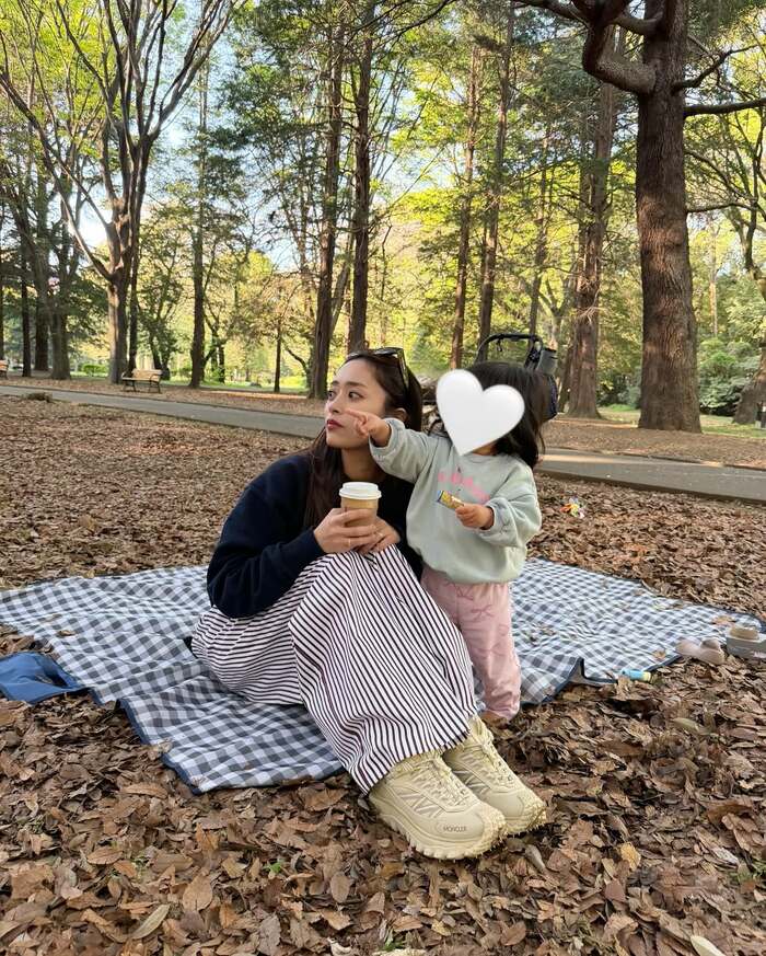 まずは、広々とした公園で三女と過ごしているショット。ネイビーのトレーナーにストライプ柄のラフなパンツを履いた近藤さんは、レジャーシートの上に両膝を立てて座っていて、隣に立つ三女が指さす方向をじっと見つめています。