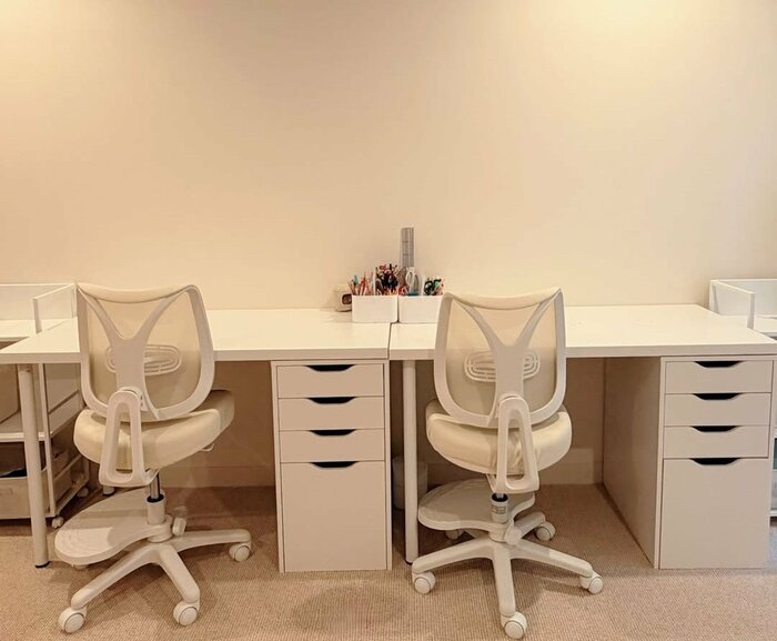 そして「次女が小学生になるタイミングで お勉強机を買いました」と、次女が4月から小学生になったことを明かすとともに、長女と次女に購入した真っ白なデスクも披露!デスクの上には、鉛筆や定規、はさみなど勉強で使う文房具がぎっしり入ったケースが置かれていて、勉強に身が入りそうです。