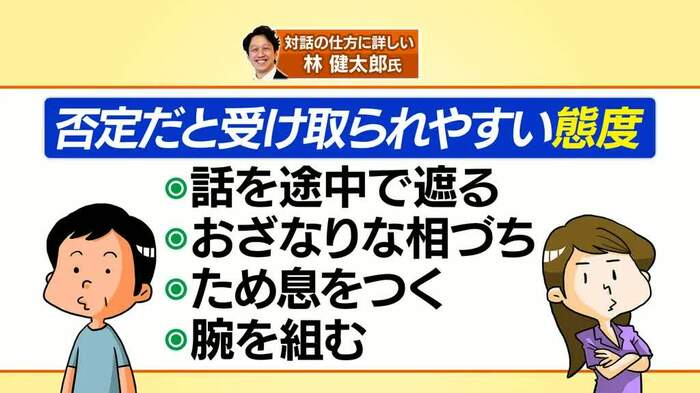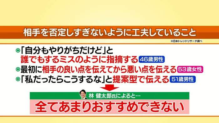 アンケート調査に寄せられた、相手を否定しないための工夫が紹介されると、千秋さんは「全部言ってしまう」と共感。しかし、林さんによるとすべてのケースがあまりおすすめできないのだそうです。