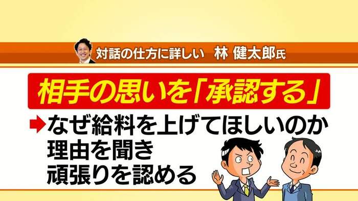 「相手の言葉を復唱するのもいいし、もっと詳しく聞かせて、と促すのも効果的。頑張りを認めてあげてから、『今は昇給できない』と話せば納得してもらえる」という林さんに、千秋さんは「昔、給料を上げてほしいと事務所に言ったら『お前、引退したいのか!』と言われた」とブラックな!?経験談でスタジオを笑わせました。