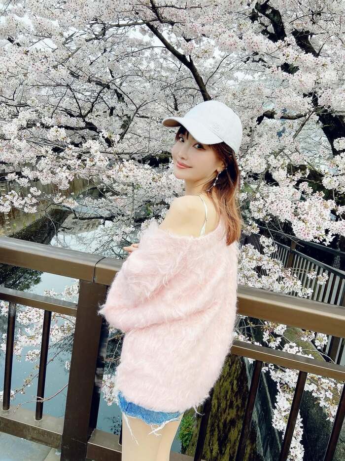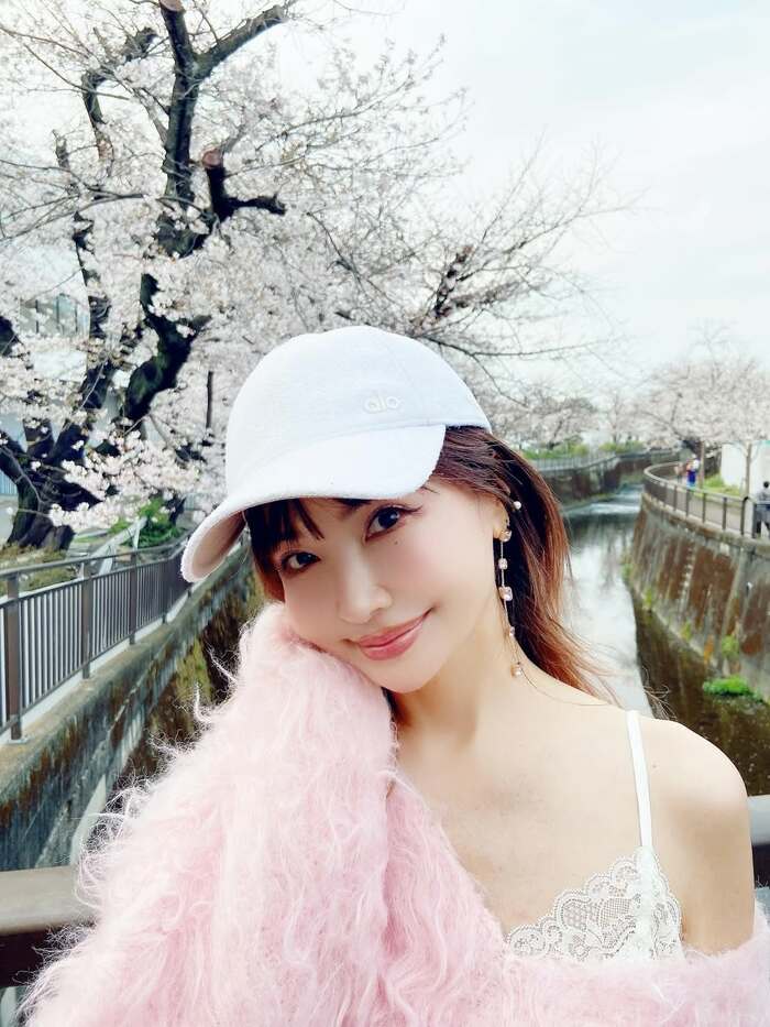 その写真を見てみると、川沿いに並ぶ満開の桜を背景に、ピンクのふわっとしたニットと白のキャップを合わせたコーディネートでカメラを見つめる平子さんの姿が。