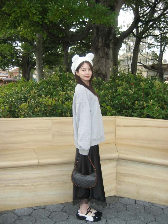 この日のAYAKAさんのコーデを見ていくと、グレーのトレーナーに、裾にレースが付いた黒のロングスカート。 頭にはミッキーの耳が付いたファー素材の白のベレー帽をかぶっていて、ニッコリとほほ笑みながらカメラに振り返る姿に思わずもん絶♡