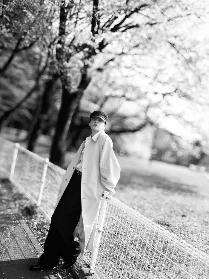 そして、フェンスにもたれながら、ロングコートをさらりと着こなしたモノクロの全身ショットや…