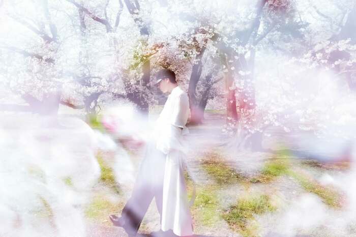 桜の木々の間を散歩している姿も。柔らかな桜色の光に包まれた、幻想的な1枚に仕上がっています。