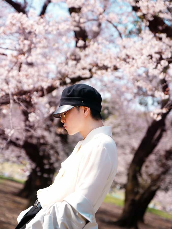 黒のキャスケットにサングラスを身に着け、白シャツ&黒パンツのスタイリッシュなコーディネートが素敵ですね。背景では桜が満開に咲き誇っており、春らしさがあふれた温かなカットです。