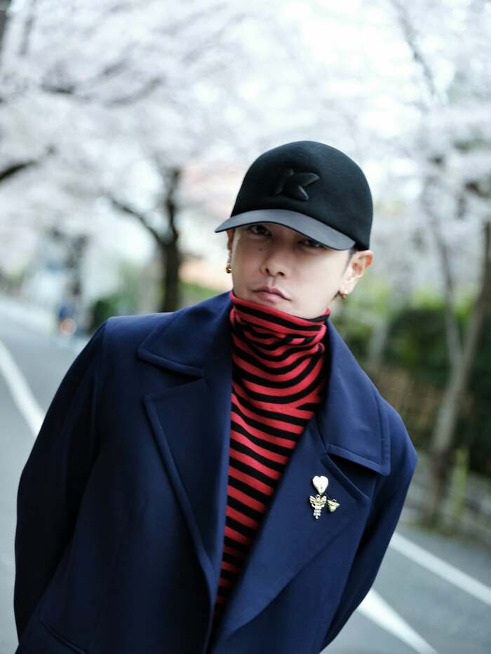 さらに、別の日にもお花見を楽しんだようで、赤×黒ボーダーのハイネックを着込み、紺色のコートを羽織った姿を公開。深くかぶった黒のキャップからじっとこちらのぞく視線にひきこまれます。