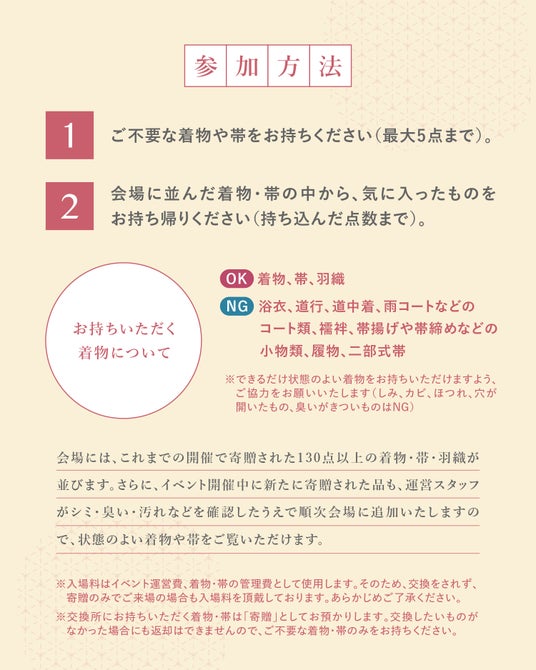 参加方法: 不要になった着物、帯、羽織(最大5点まで)を持参。持ち込み点数分、会場の品から選んで持ち帰り可能。
