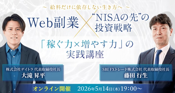 SBI FXトレード株式会社(本社:東京都港区、代表取締役社長:藤田行生、以下「当社」)と株式会社デイトラは、これからの時代に求められる「働き方」と「資産形成」の両輪をテーマとしたコラボウェビナー「【給料だけに依存しない生き方へ】Web副業×" NISAの先" の投資戦略「稼ぐ力×増やす力」の実践講座」を2026年5月14日(木)19:00~にオンライン開催いたします。