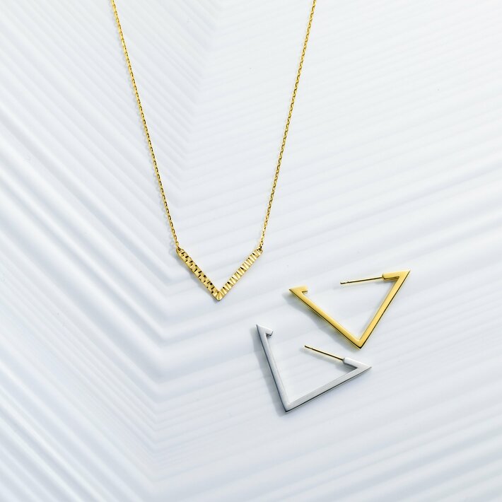 ミニマルながら印象的なVラインは、装いを選ばず調和するデザインです。