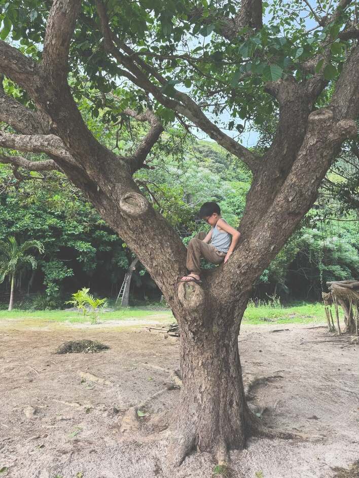 そこには、中央にそびえたつ、大きな木に臆することなく登る長男の姿が。木の後ろにも緑豊かな自然が生い茂っていて、空気を吸うだけでもリラックスすることができそうです。