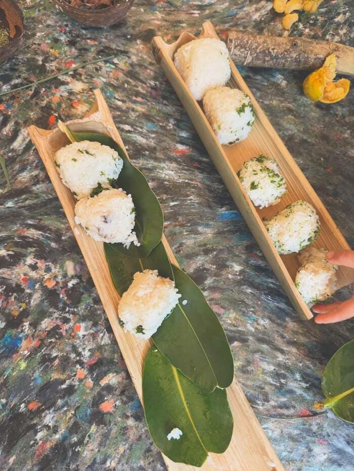吉川さんによると「ここでの食事は、お米とオイルと醤油と酢以外自給しなくてはならないというルール」なんだそうで、お皿代わりになった竹に味付けされたミニおにぎりや…。