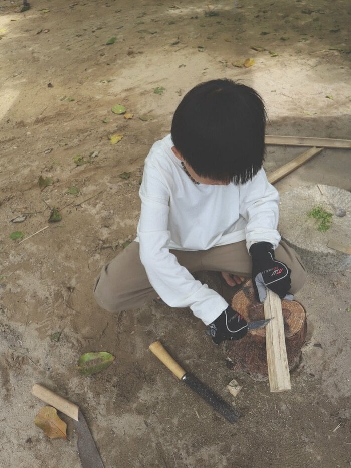 さらに、地面に座って手袋を付け、懸命に木を削るような長男のショットも見ることができます。子どもたちの力で必要な道具を作るなんて、なんとも感心してしまいます。