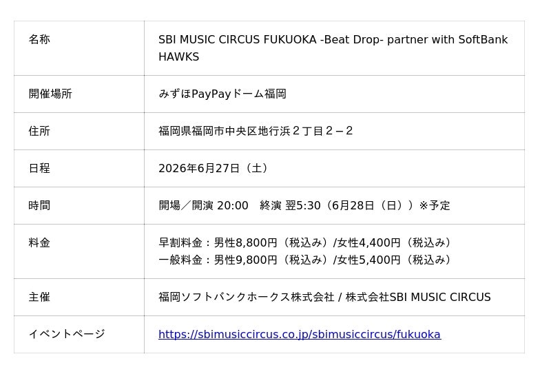 株式会社SBI MUSIC CIRCUS(本社:東京都港区、代表取締役社長:大付 楽洋、以下「当社」)は、福岡ソフトバンクホークス株式会社(本社:福岡市中央区、代表取締役社長CEO:後藤 芳光)と共催で、2026年6月27日(土)にみずほPayPayドーム福岡にて開催する「SBI MUSIC CIRCUS FUKUOKA -Beat Drop- partner with SoftBank HAWKS」の第2弾出演アーティストを発表しました。