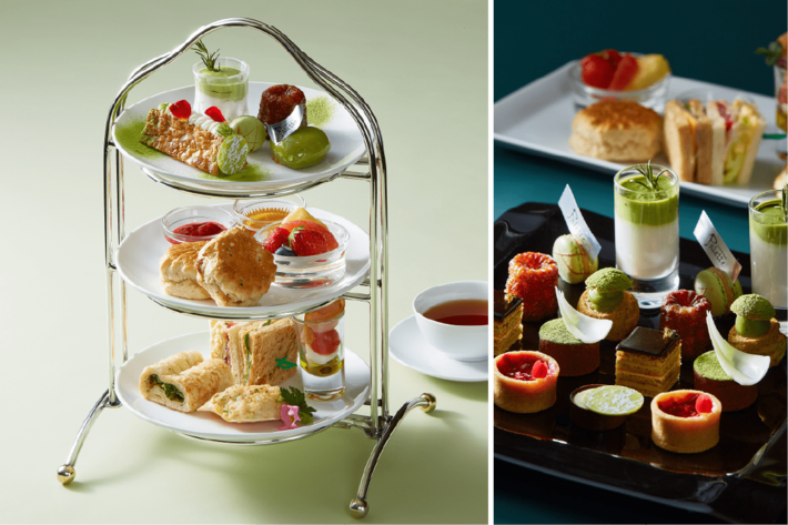 抹茶やピスタチオを使用したスイーツを中心に、見た目と味わいともに爽やかな品々が並ぶアフタヌーンティーは、まるで新緑の風景をそのまま閉じ込めたかのような逸品。