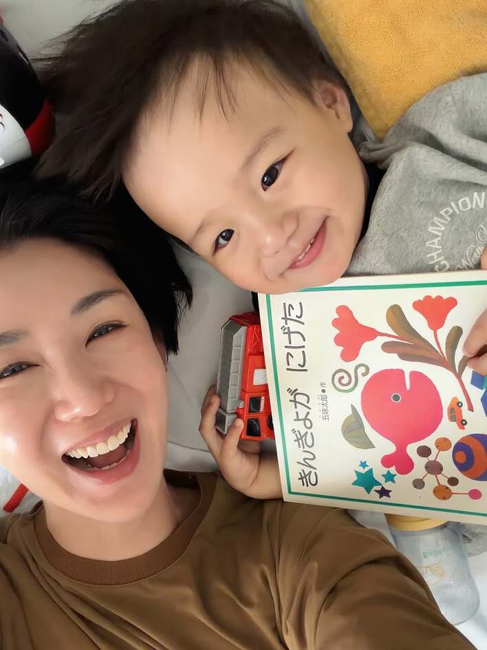 まずは、一緒にごろんと横になり、にっこり笑顔を浮かべた仲むつまじい2ショット。陽太くんの手には絵本やおもちゃが握られていて、2人でのんびりとした時間を過ごしていたことがうかがえます。