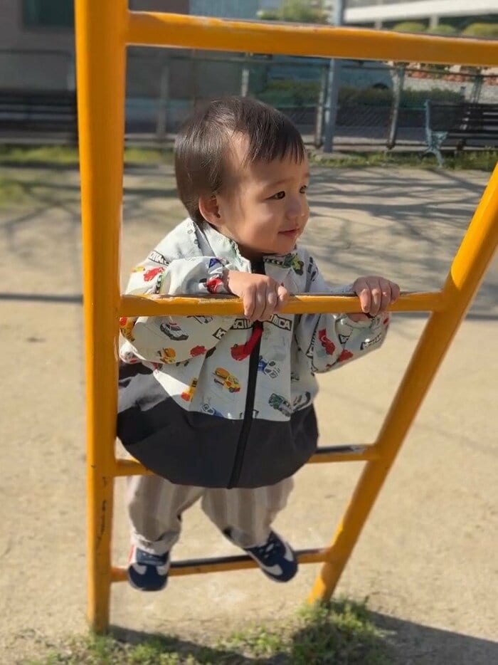さらに、温かな日差しの中、陽太くんが遊具で遊んでいる様子も披露!陽太くんは両足をぐっと踏ん張り遊具に立ち、小さな手でしっかりとバーをつかんでいて、その成長っぷりに驚くばかりです!にこにこと楽しそうな笑みを浮かべる姿からは、周囲の世界への興味や好奇心がぐんぐんと広がっていることが感じられ、心がほっこりします。