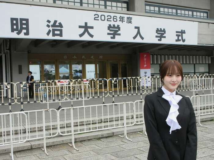 そこには、「2026年度 明治大学入学式」と書かれた大きなパネルがかけられた会場をバックに、微笑みながらたたずむ紗来さんの姿が。同じく明治大学出身の真凜さんの後輩になるようです。