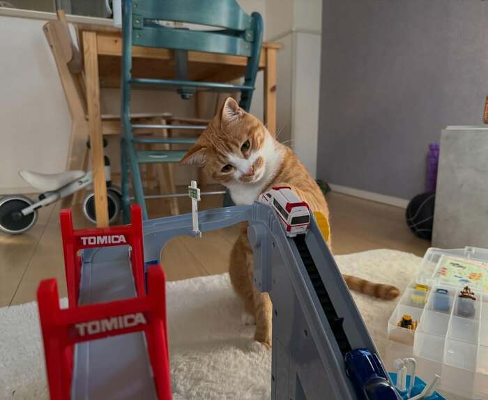 今回は、2歳の男の子が遊ぶトミカを、自身の“はみ肉”で邪魔する猫の姿をご紹介。SNSでは「何度も笑って見ちゃいます!」「全く動じない猫さま好き」などと、693万回以上再生されるほど反響を呼んでいます。(2026年4月10日時点)