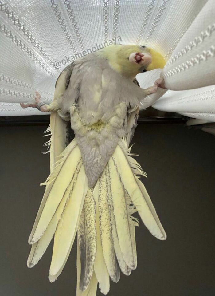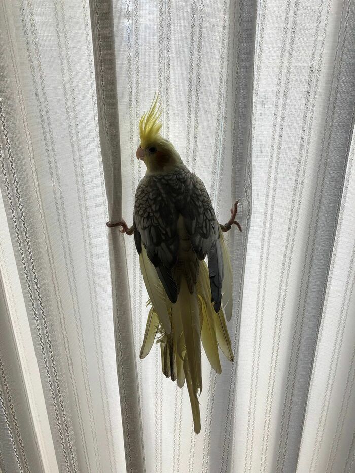 実はこの姿、飼い主によると4年ほど前に撮影したもので、当時は、飛び方がうまくいかず、カーテンに不時着し必死にしがみついていたところを捉えたもの。