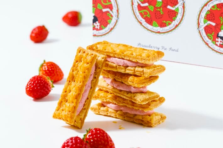 サクッと軽やかなパイ生地に、 甘酸っぱいイチゴの風味をいかした、なめらかなイチゴクリームをサンドしました。クリームには、イチゴ風味のつぶつぶを忍ばせ、食感にアクセントを加えました。ひと口ごとにイチゴの香りと甘さが広がります。ほどけるパイの食感に、思わず笑顔になる、可愛くて上品なイチゴの味わい。“イチゴ好き”の心をつかむ一品に仕立てました。