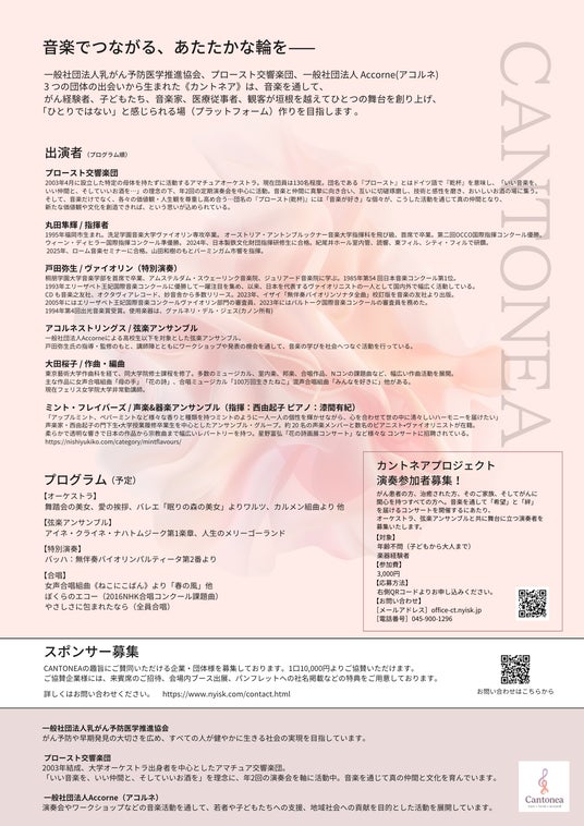 一般社団法人 乳がん予防医学推進協会、プロースト交響楽団、一般社団法人Accorne(アコルネ)は音楽を通じてがんと向き合う人々を支える共創型プロジェクト「CANTONEA(カントネア)」