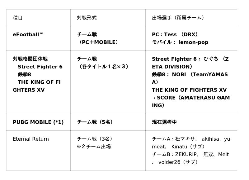ECA 2026にて正式に競技が実施される4種目のうち、3種目は第20回アジア競技大会(2026/愛知・名古屋)の正式種目です。JESUは、愛知・名古屋アジア大会に向けた選手強化を目的として、ECA 2026に先般決定した日本代表候補選手を派遣します。ただいま代表候補を選考中の「PUBG MOBILE - Asian Games Version」については、現在実施中の競技会にて決定する日本代表候補選手を派遣予定です。