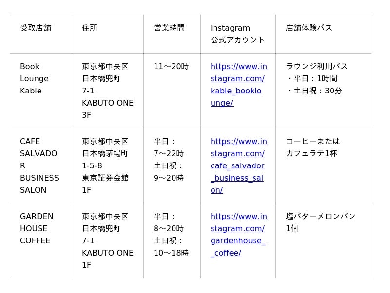 配布場所:KABUTO ONE、KABEAT、GARDEN HOUSE COFFEE、Book Lounge Kable、CAFE SALVADOR BUSINESS SALON、東京証券会館、日本橋観光案内所、中央区観光情報センター、メトロリンクバス構内