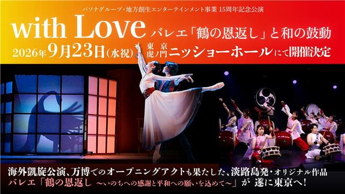 株式会社パソナグループ(本社:東京都千代田区、代表取締役会長CEO 若本博隆)が事務局を務めるバレエ団「PASONA Awaji World Ballet」は、オリジナル作品『with Love ~バレエ「鶴の恩返し」と和の鼓動~』を9月23日(祝・水)にニッショーホール(東京都港区)で上演いたします。