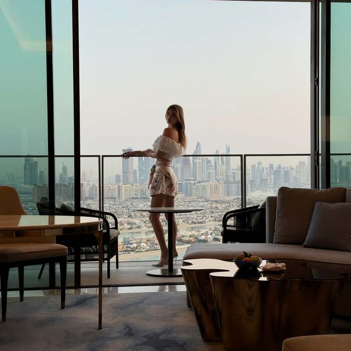 公開された写真には、海外ホテルの高層階のバルコニーで、絶景を背にこちらを振り返ったマギーさんの姿が。マギーさんは、オフショルトップスにショートパンツ、ピンヒールを合わせたコーデをしていて、美しいスタイルに思わず目を奪われます。