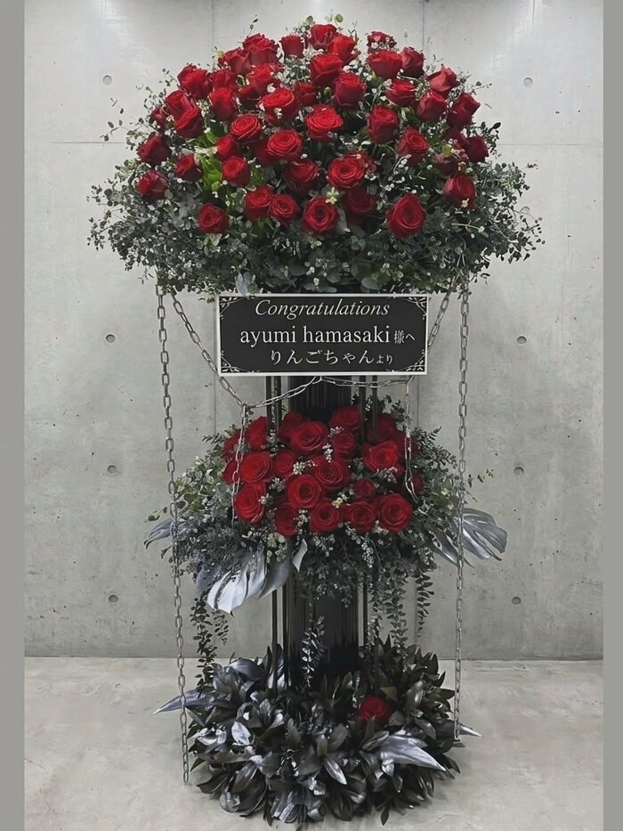 まずは「Congratulations ayumi hamasaki 様へ りんごちゃんより」とメッセージを寄せて送った公演祝いから。赤いバラの花がふんだんに使われた祝い花は、ゴージャスな雰囲気があふれていて、とても素敵です!
