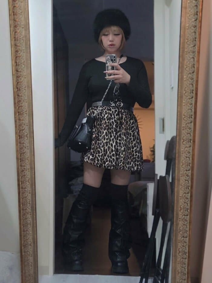 黒のピタッとしたトップスに、ヒョウ柄のミニスカートと黒のニーハイブーツを合わせたコーディネートで、絶対領域をチラ見せ。ハイトーンヘアの上からモコモコの黒帽子をかぶり、黒のショルダーバッグを提げた統一感あるスタイルが素敵ですね!
