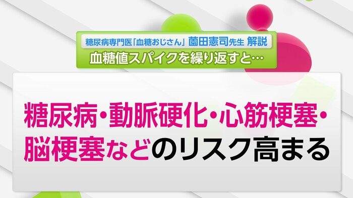 「血糖値スパイク」を繰り返すと、薗田先生によりますと糖尿病はもちろん、動脈硬化、心筋梗塞、脳梗塞などのリスクが高まるということです。