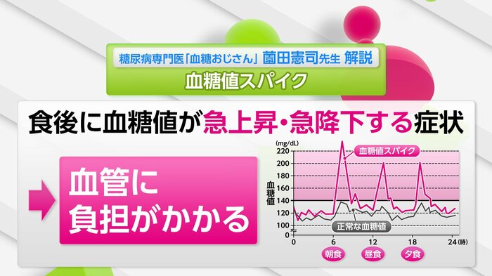 「血糖値スパイク」、改めてどんな症状なのかというと…食後に血糖値が急上昇・急降下、乱高下を繰り返すことで血管に負担がかかってしまうということなんです。