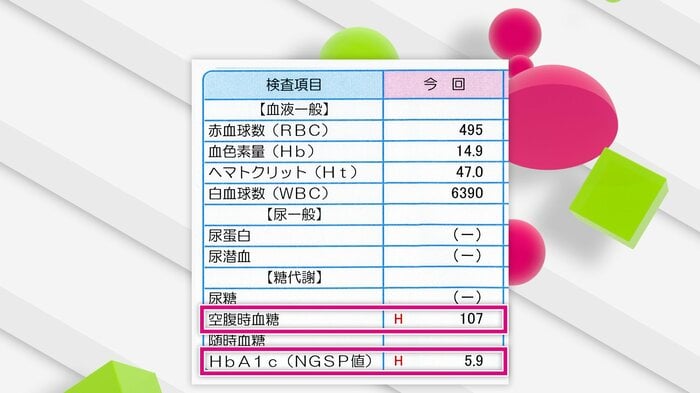 注目すべきは「糖代謝」の項目の「空腹時血糖」。これと平均血糖値の指標「ヘモグロビンA1c」の数値が高いと要注意だといいます。