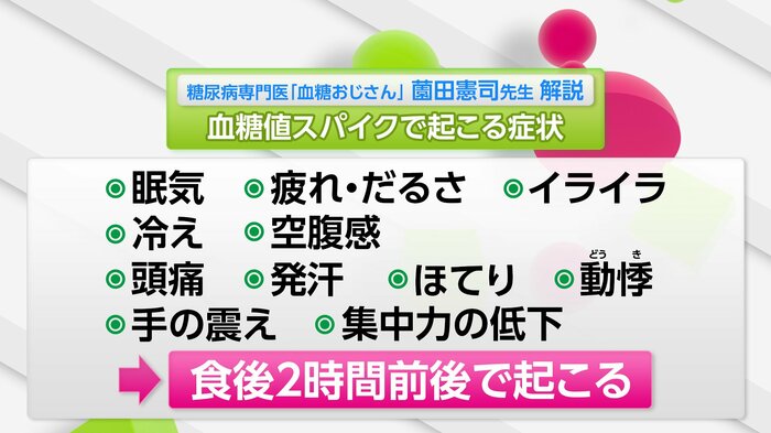 眠気、疲れ・だるさ、イライラ、冷え、空腹感、頭痛、発汗、ほてり、動悸、手の震え、集中力の低下…、これらが食後2時間前後で起こることが多いということなんです。