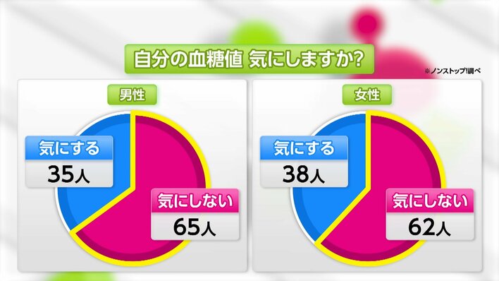 しかし、「日々の生活で“血糖値”を気にしている」という人は少なく、男女200人にとった番組アンケートでも、「血糖値を気にしない」という人は約6割以上。