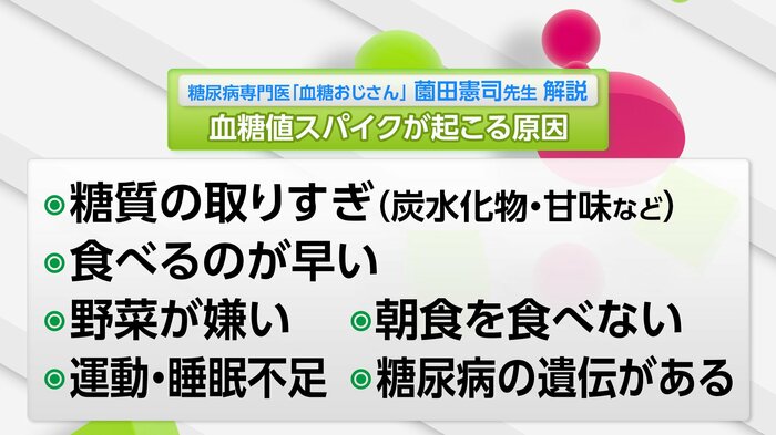 「血糖値スパイク」がなぜ起こってしまうのか…なんですが、まず食生活で糖質の取りすぎ(炭水化物含む)、食べるのが早い、野菜が嫌い、朝食を食べない、生活習慣においては運動・睡眠不足、糖尿病の遺伝があるというところも一つの要因だということです。