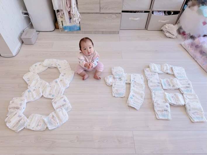 公開された写真にはリビングのフローリングの上で、おむつを「8ヵ月」の形に並べた横に、夢空ちゃんがちょこんと座っています。淡いピンク色のベビー服を着ており、少し伸びてきた柔らかそうな髪の毛が印象的です。まん丸な瞳で不思議そうにこちらを見つめる姿に、思わず抱きしめたくなるような愛しさを感じます。