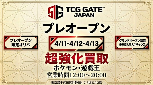 日本のトレーディングカード文化を世界へ発信する拠点として今春・秋葉原にグランドオープンを予定する「TCG GATE」(運営:株式会社Anmore)は、2026年4月11日(土)よりプレオープン営業を開始いたします。期間中はPSA10オリパの販売や超強化買取、グランドオープン当日の福袋優先購入券抽選など、限定企画を先行実施いたします。