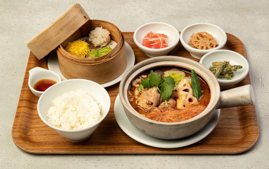 スパイスが香る麻辣湯と蒸点心3種のアジアン定食。麻辣湯のスパイスが体を内側から元気にしてくれます。