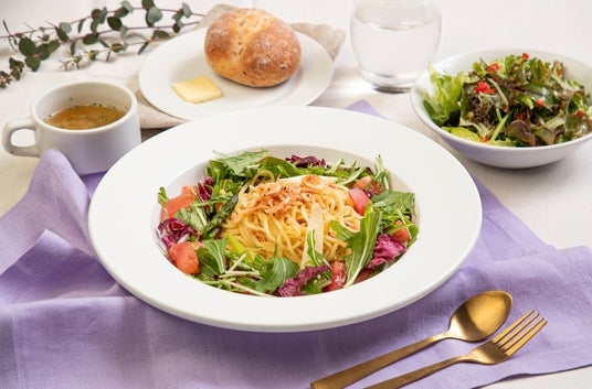 ◇桜海老とアスパラの菜園風ペペロンチーノ 1,380円(週末1,660円 ※ドリンクバー付き)春の恵みを一皿に。香ばしい桜海老と、みずみずしいアスパラガスを合わせた菜園風ペペロンチーノ。