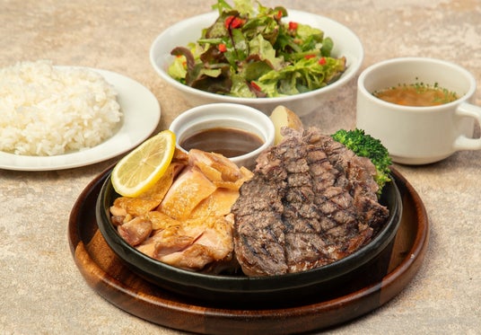 旨みあふれるリブロースステーキと、ジューシーに焼き上げたチキンを一度に楽しめる贅沢な一皿。