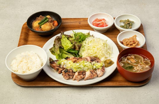 三元豚ロースをグリルし、特製の葱塩ダレで。副菜の関西風肉じゃがもボリューミーなダブルメイン定食。