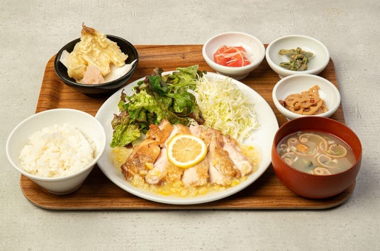 香ばしく焼き上げたチキンソテーに、自家製塩レモンのソース。副菜には、淡白な旨味のキスを塩麹漬けにし、竜田揚げにしました。