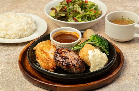 香ばしく焼き上げたハンバーグとチキンに、サクッと軽やかな白身魚のフライを組み合わせた、バリエーション豊かな一皿。それぞれ異なる食感と味わいを一度に楽しめる、満足度の高いグリルプレートです。