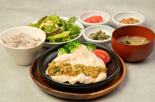 低カロリー高たんぱくの鶏むね肉をブロッコリーと一緒に鉄板で提供。十五穀米と副菜もバランスを考えたヘルシーランチ。