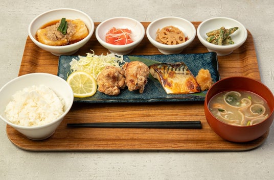 鯖の塩糀焼きと唐揚げ、そぼろ豆腐の肉・魚・野菜の揃った和定食。