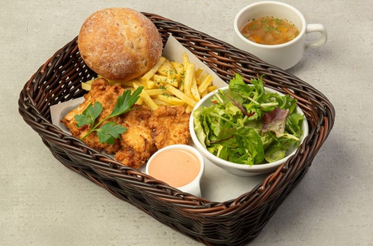 外はカリッと、中はジューシーに仕上げたフライドチキンを主役に、ポテト・サラダ・スープ・パンをワンプレートに詰め込んだ満足度の高い一皿。特製ソースがチキンの旨みを引き立て、最後まで飽きずに楽しめます。軽めにも、しっかりランチにも応える“ちょうどいいボリューム感”も魅力です。
