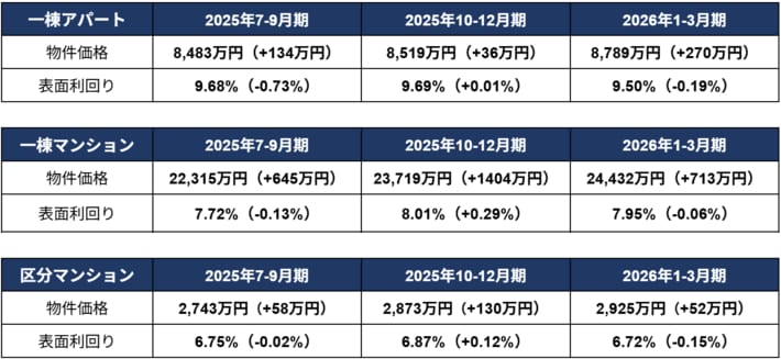 ※表面利回り・物件価格は期間中の平均 ※()内は前期比